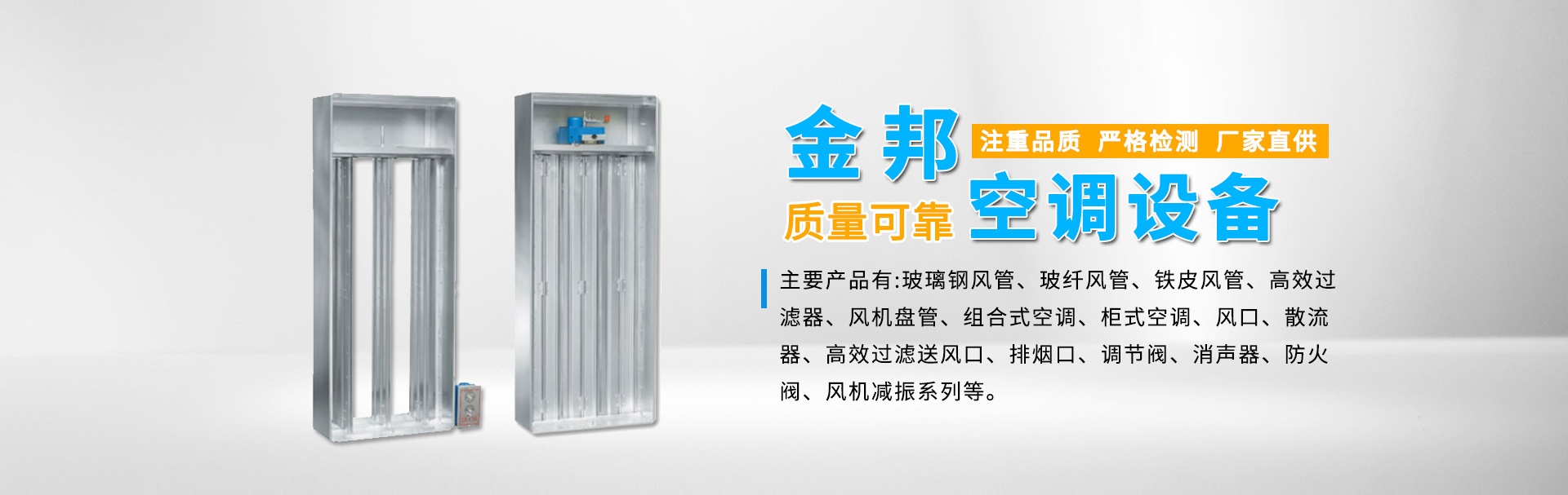 江蘇金邦空調(diào)設(shè)備制造有限公司專業(yè)生產(chǎn)玻璃鋼風(fēng)管、玻纖風(fēng)管、鐵皮風(fēng)管、高效過濾器、風(fēng)機(jī)盤管、組合式空調(diào)、柜式空調(diào)、風(fēng)口、散流器、高效過濾送風(fēng)口、排煙口、調(diào)節(jié)閥、消聲器、防火閥、風(fēng)機(jī)減振系列等產(chǎn)品